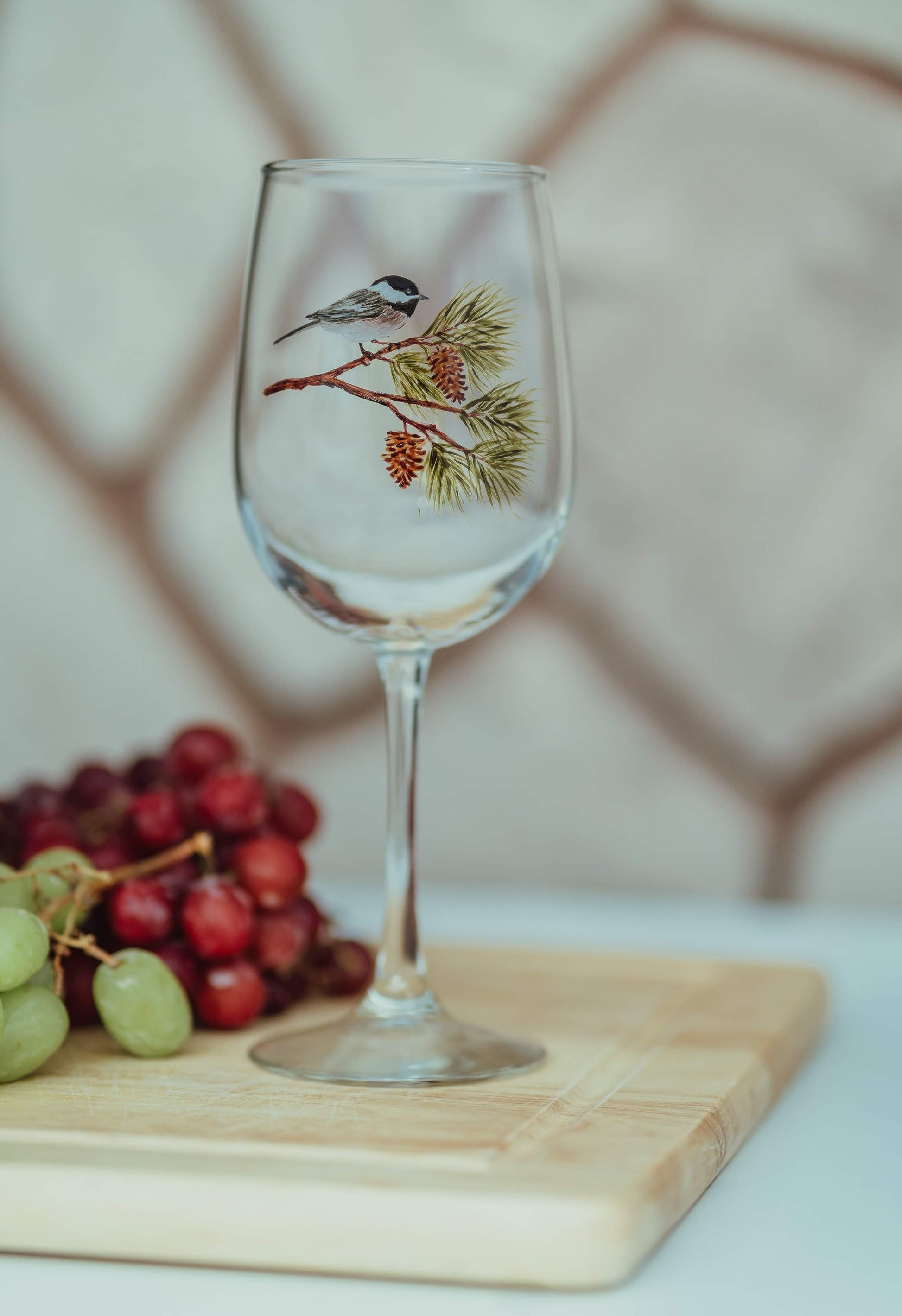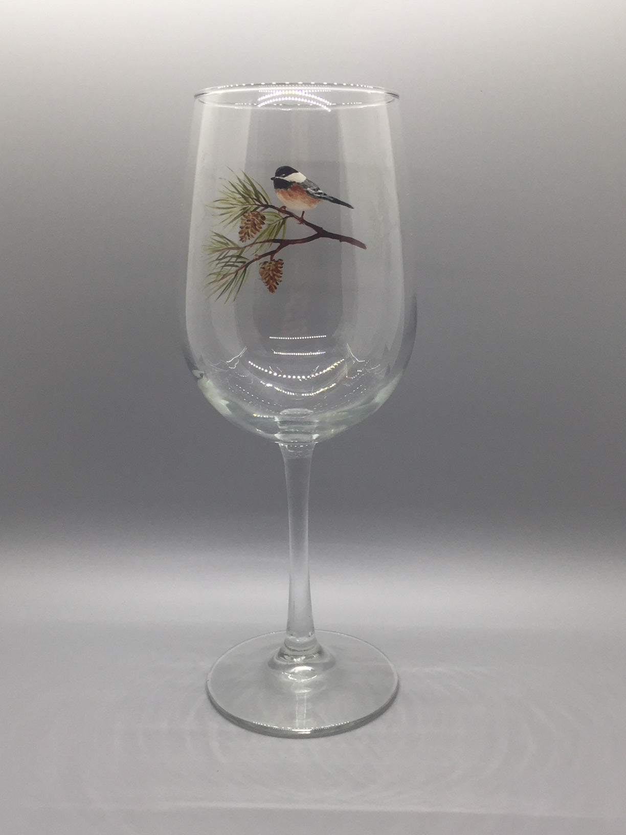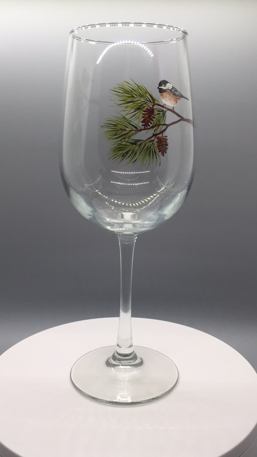 Add a rustic touch to your table. Chickadee is perched on beautiful pine branches with little brown pine cones peaking through the long green needles. Whether you are looking for a gift, holiday décor, or as an accent, this hand painted glass provides endless enjoyment for the nature enthusiasts.