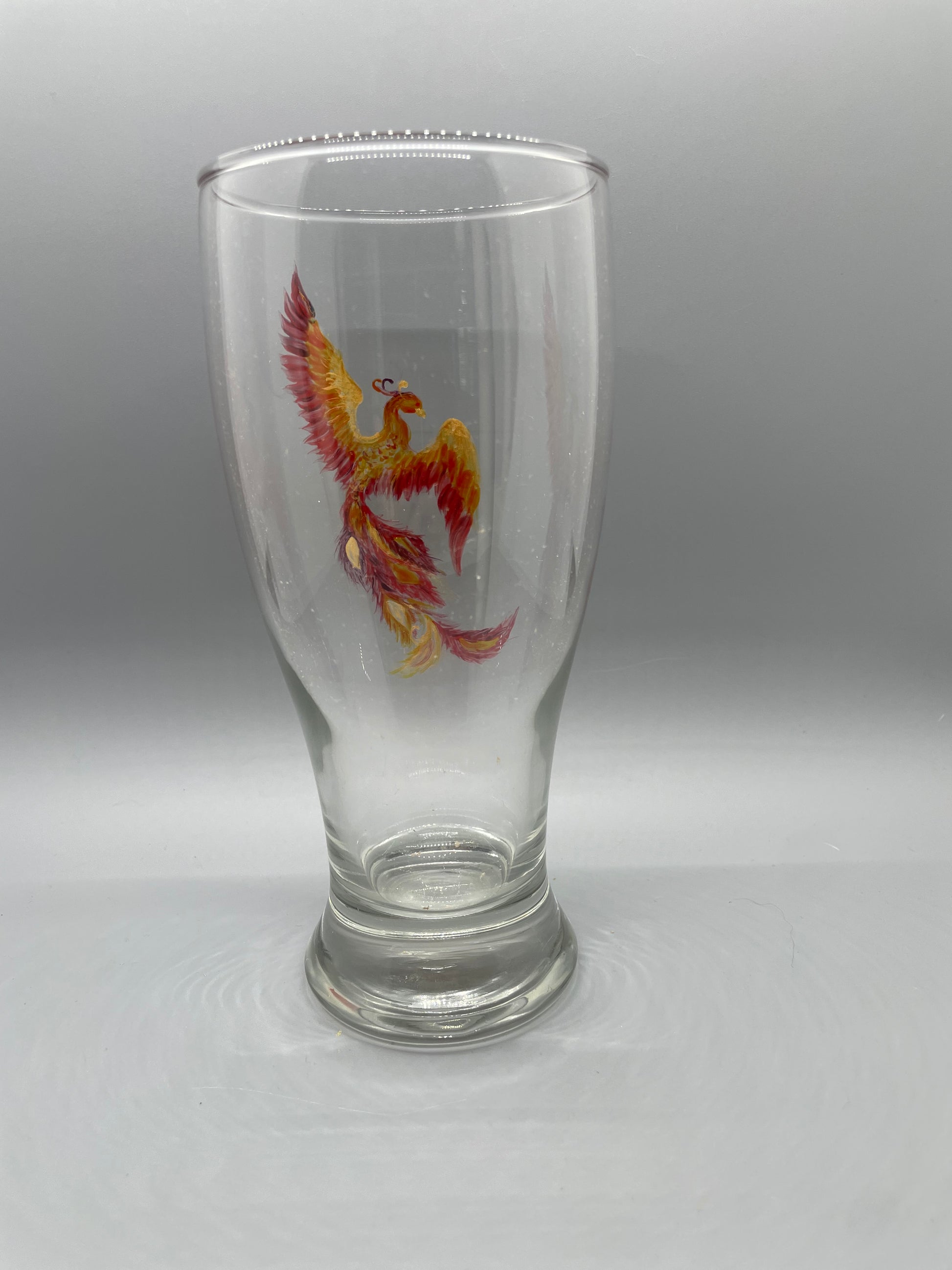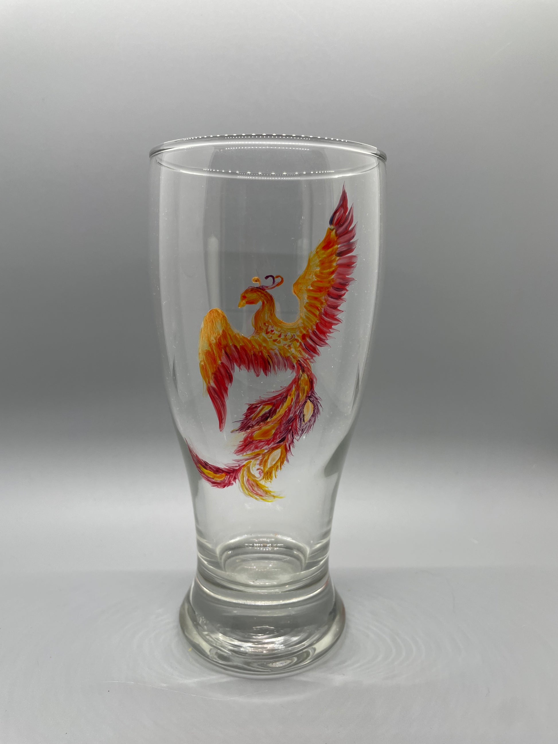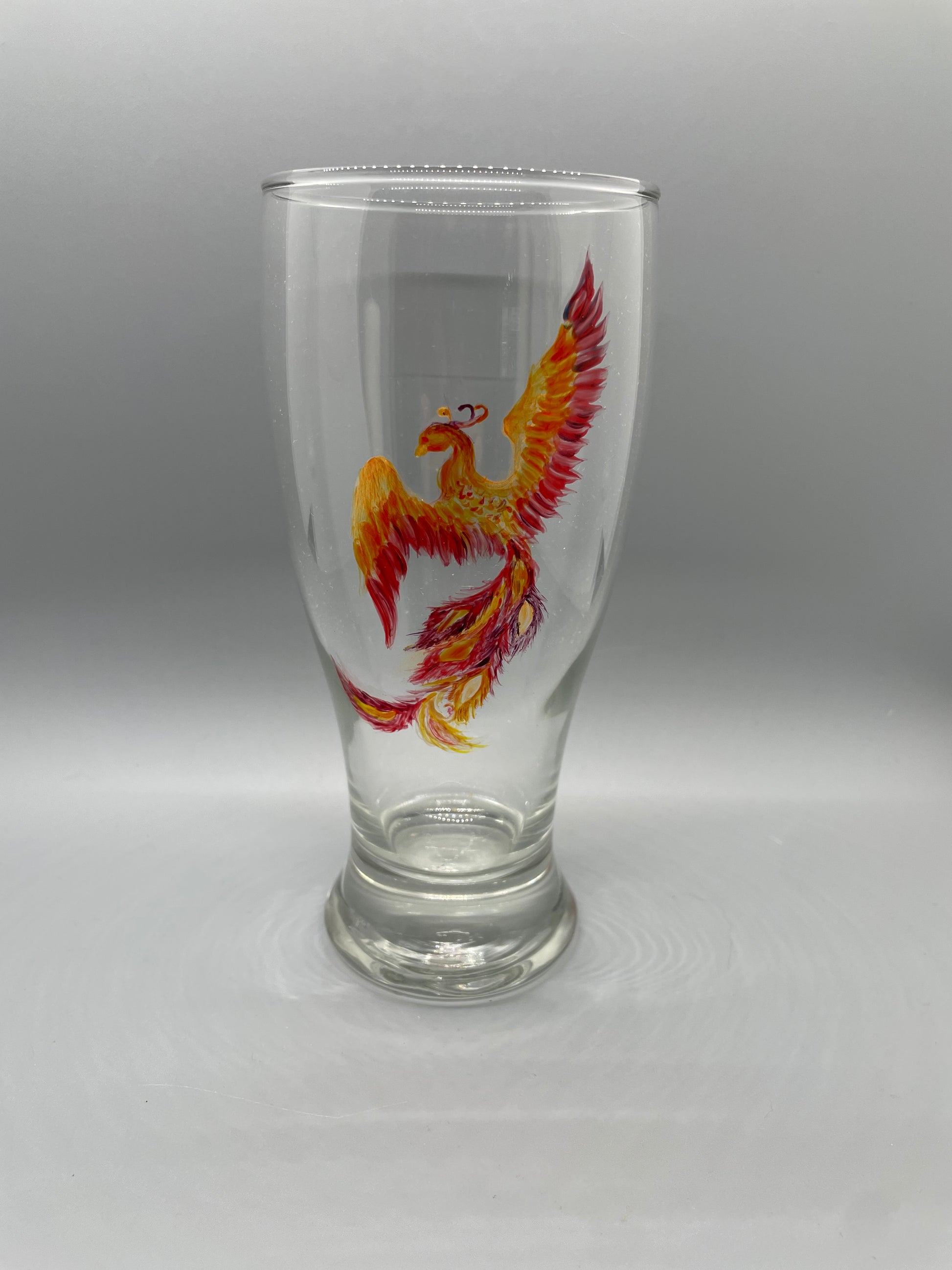 Rising from the ashes, this phoenix is full of elegance. Colors range like a fire. Hand painted golden accents highlight the brilliance a phoenix can bring.