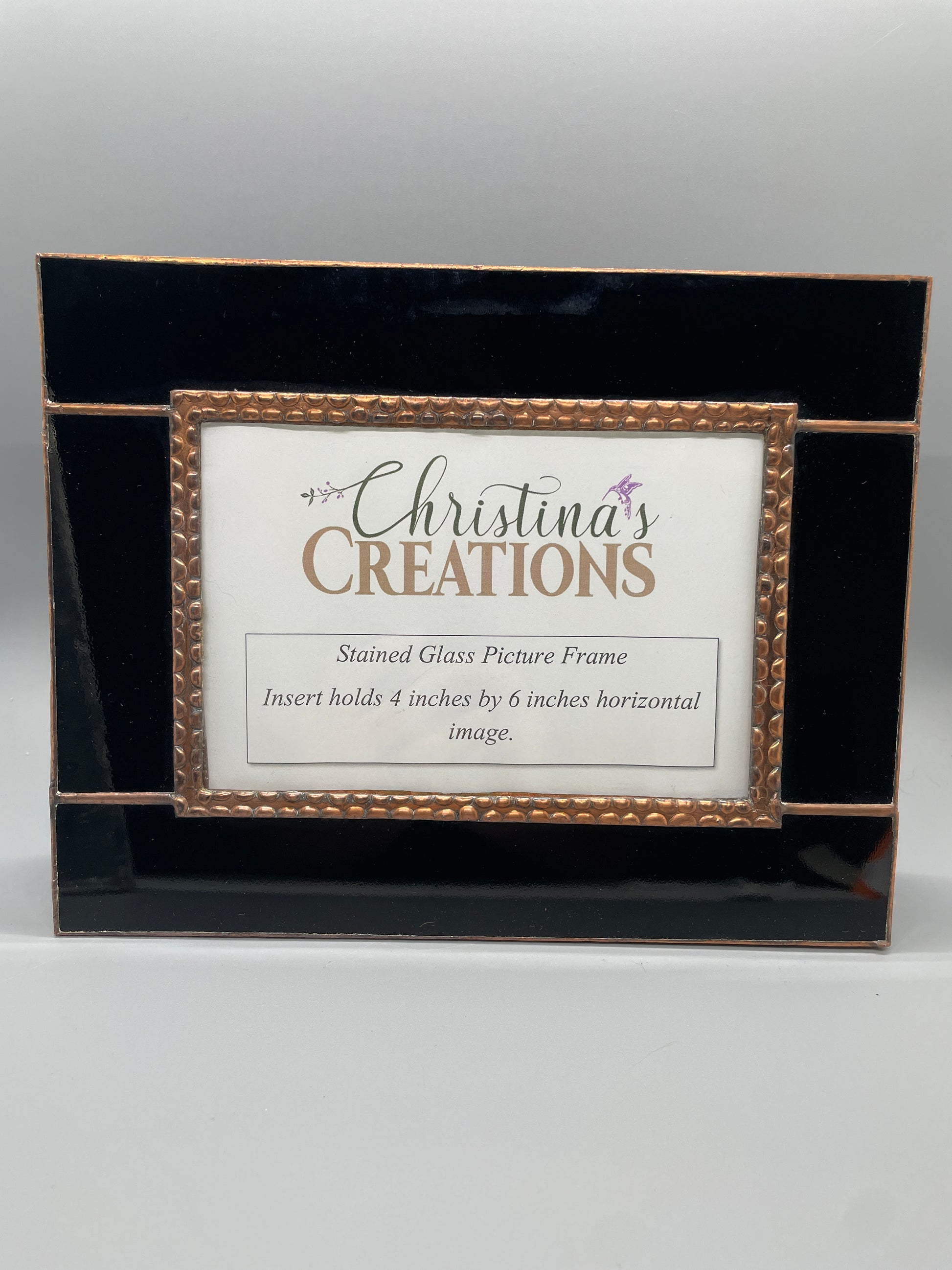 Bring a touch of individuality to any room. This is a glass picture frame with a glass center for your 4x6 photo. This frame features black glass with decorative soldering using copper patina. A beautiful frame!